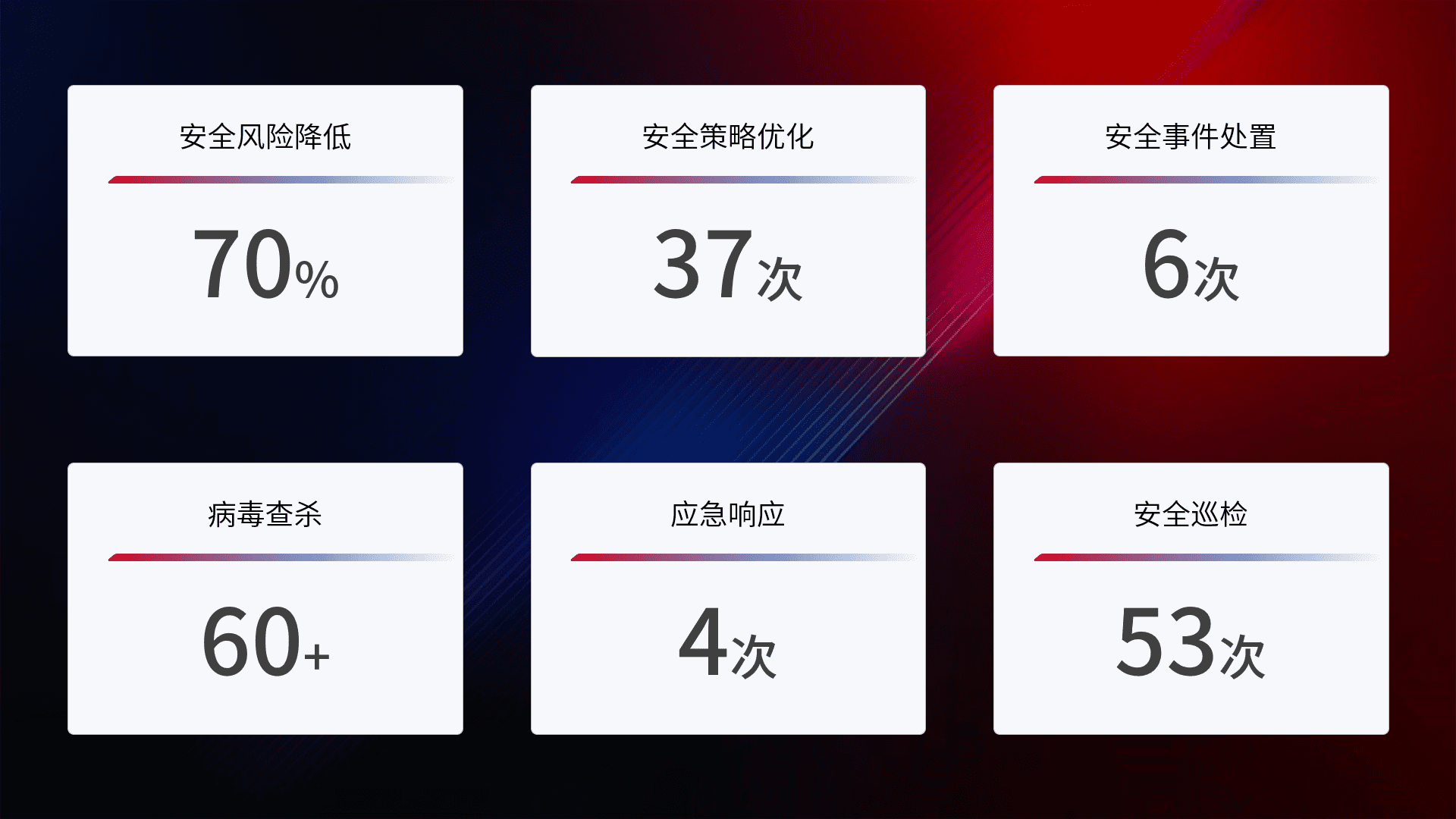 提供全面的安全事件报告体系,,,,包括处置报告、、、周报、、、、季度和年度总结,,结合持续监控,,帮助客户深入了解网络安全状况。。。