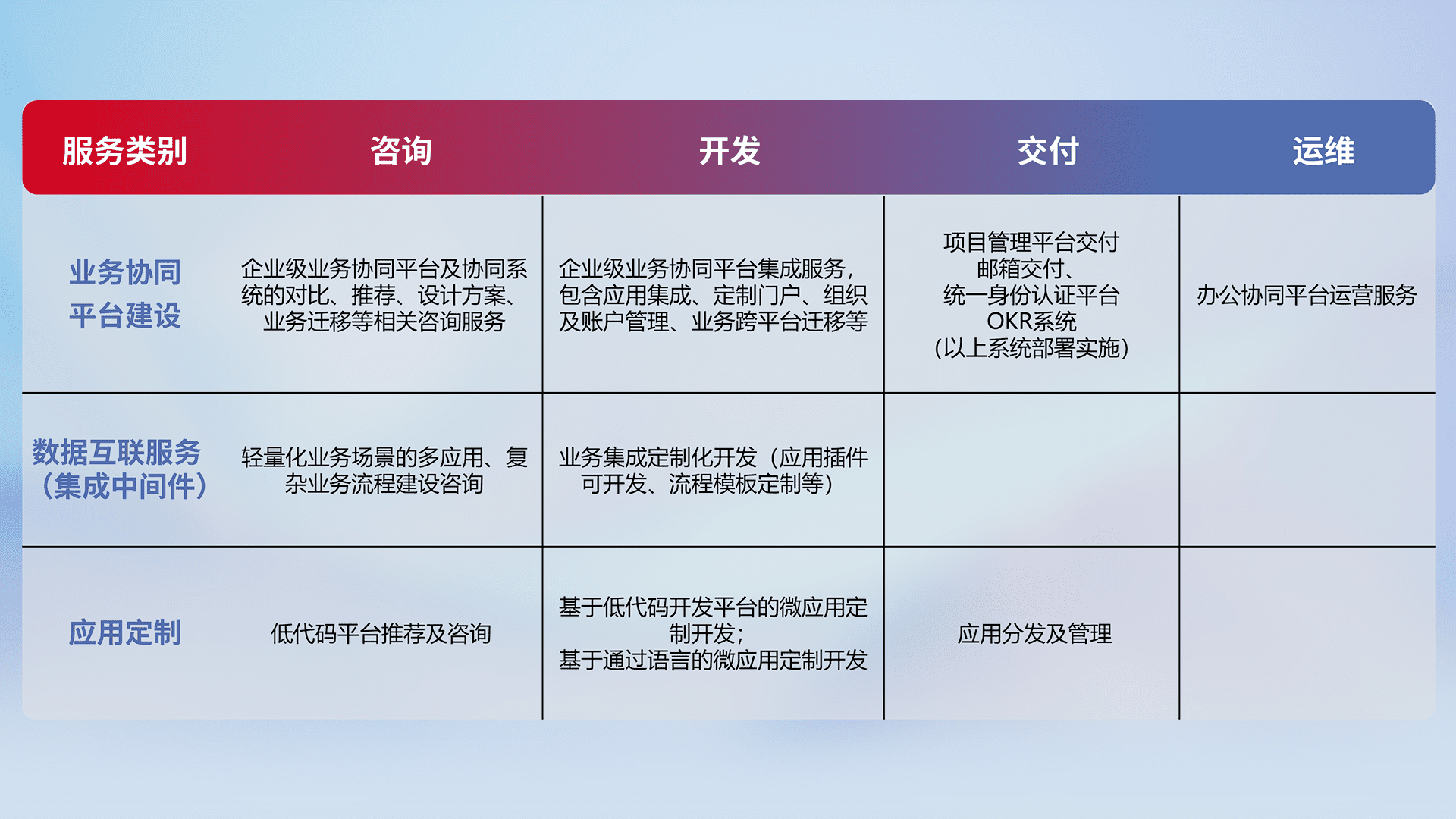 针对钉钉、、、、企微、、IDaas等平台级产品提供产品的规划、、方案、、、、交付、、、定制化开发等服务,,实现如统一协同办公、、、智能客户服务、、混合会议管理、、、、智能数据查询、、、、等业务场景,,,,实现数字化转型。。。