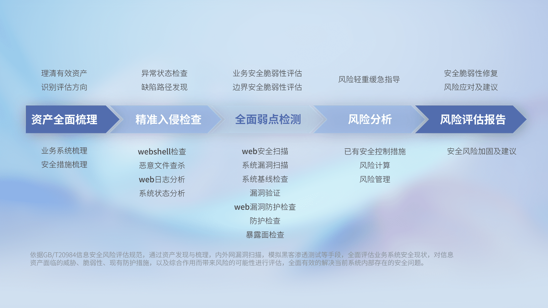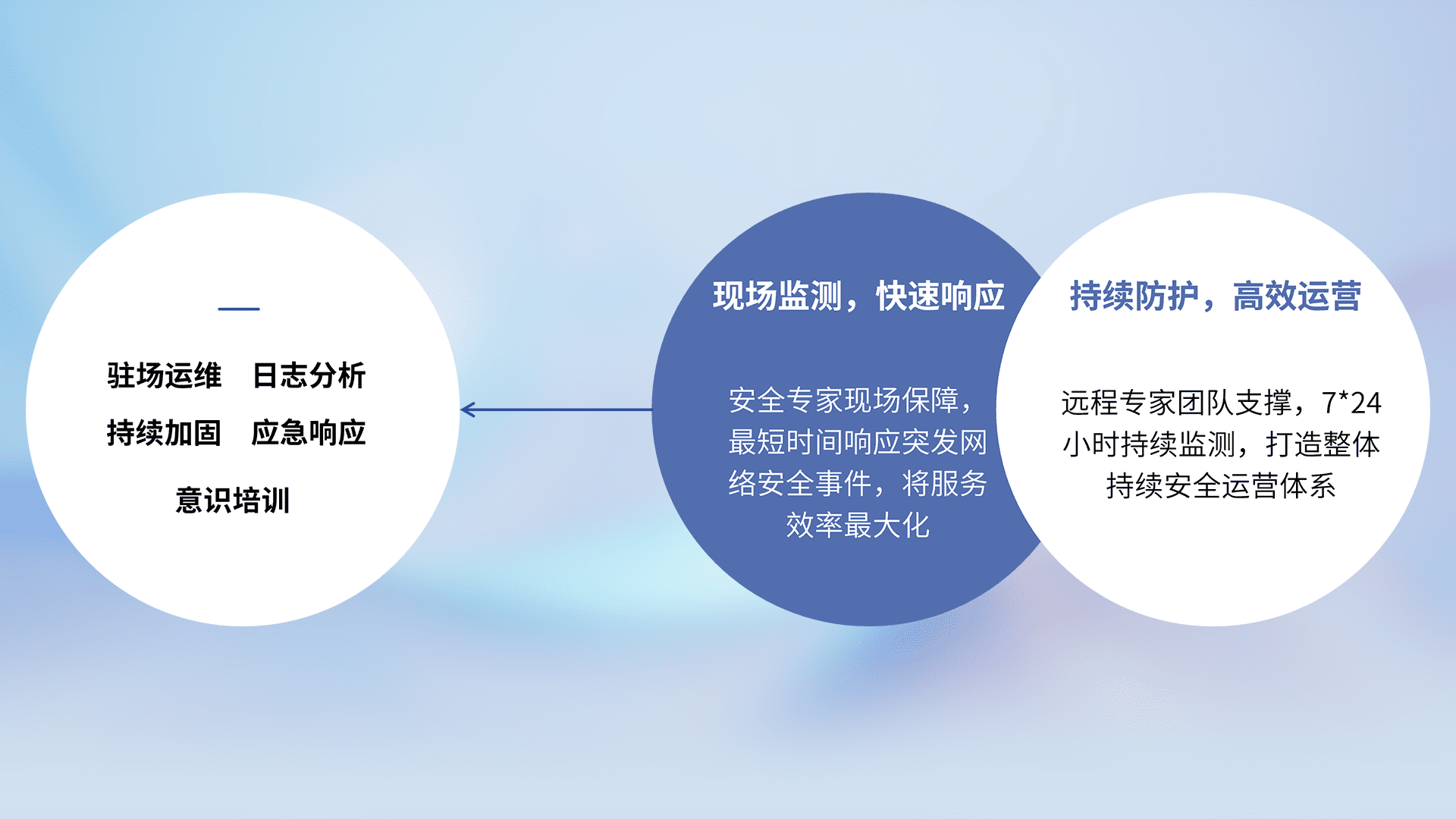 针对客户行业特性,,,,以专业的安全服务+多厂商联合解决方案提供专属的一站式安全管理服务,,帮助客户全面感知网络空间威胁,,,,基于识别、、检测、、、、分析、、防护、、、、监测、、、响应的服务理论模型,,,,从方案咨询、、、集成交付、、、评估验证、、优化加固、、运维运营,,,致力于为客户提供完整的闭环管理式安全服务。。以实战经验为客户打造高抵御风险的安全体系,,,帮助客户发现威胁、、对抗威胁、、处置威胁,,,不断积累安全对抗能力,,持续保障数字化安全。。。。